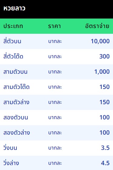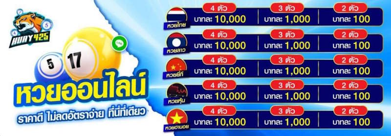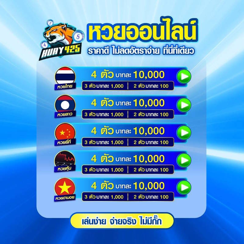 อัตราจ่ายของเว็บ huay425.com จะเหมือนกับ rich24hr.com (และอีกหลายๆเว็บ) คือใช้อัตราจ่ายสูงสุดที่จ่ายแล้วไม่ขาดทุนคือ 3 ตัว บาทละ 1,000 บาท นั่นก็คือถ้าแทงทุกตัวตั้งแต่ 000 ถึง 999 ใช้เงิน 1,000 บาท ก็จะถูกรางวัล 1,000 คือเท่าทุน ซึ่งเป็นโมเดลที่หลายๆเว็บเริ่มใช้