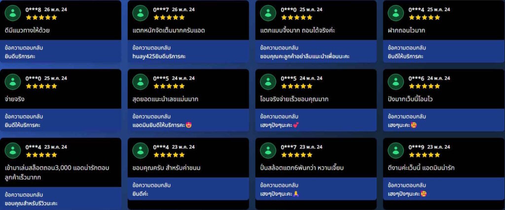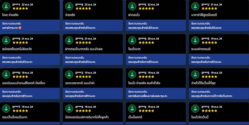 เว็บ huay245.com ก็มีระบบรีวิวของคนใช้งานภายใน ซึ่งสมาชิกเท่านั้นถึงจะเห็น และก็ไม่มีใครสามารถบอกได้ว่าเป็นรีวิวของคนใช้งานจริงๆหรือ make ขึ้นมาเพราะไม่มีหลักฐานอะไรทั้งนั้นนอกจากข้อความและเบอร์ที่ปิดบางส่วน แต่อย่างน้อยก็ให้เห็นความเคลื่อนไหวของเว็บว่ายังอับเดทและมีคนใช้งานอยู่ตลอดเวลา
