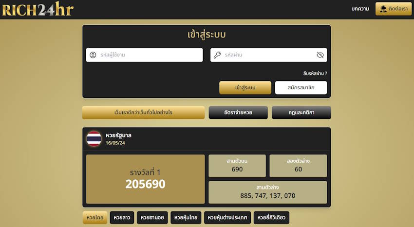 วันนี้ทางเว็บของเรา Ruay247.com จะมาทำการรีวิวเว็บหวยออนไลน์น้องใหม่ชื่อ rich24hr.com ซึ่งเป็นเว็บที่เปิดตัวใหม่มาได้ไม่นาน แต่ดูแล้วมีความเป็นมืออาชีพสูง ระบบเว็บทำได้ดี หน้าตาดูเรียบง่ายคล้ายๆกับหลายๆเว็บที่เปิดมาก่อนแต่ดูโมเดิร์นและทันสมัย ใช้โทนสีดำ-ทองทั้งเว็บ มีการออกแบบ UI ที่มีความมันเงา (Sleek) ที่สะท้อนถึงความเป็นไฮโซนิดๆ