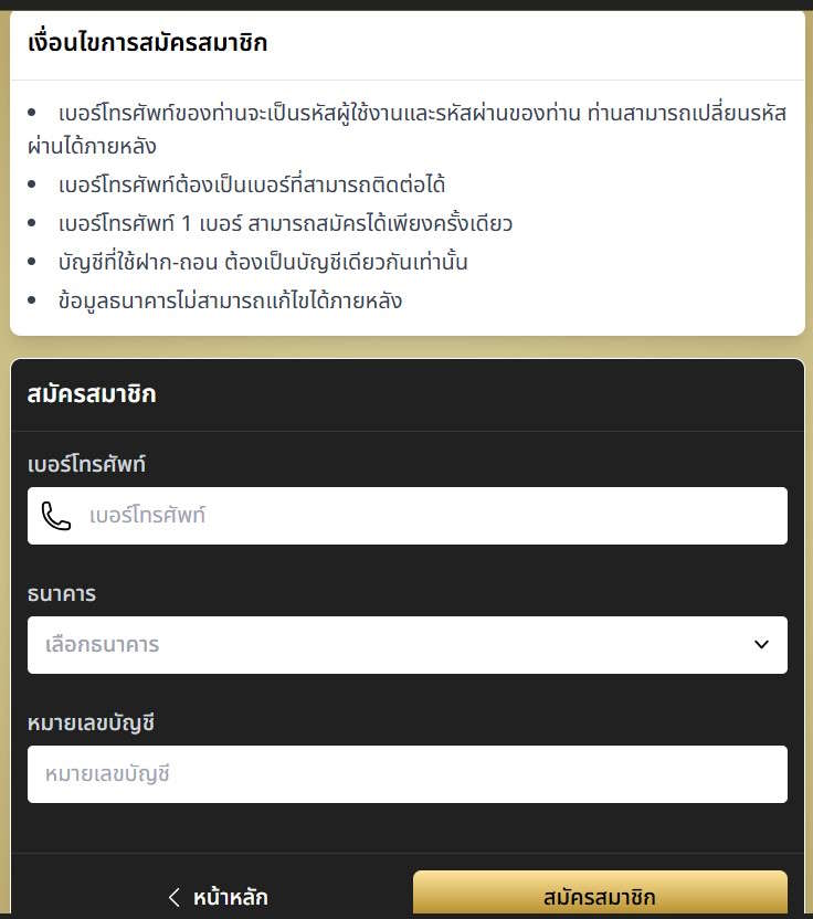แค่กรอกหมายเลยโทรศัพท์ เลือกธนาคาร และกรอหมายเลขบัญชีธนาคารที่ต้องการใช้กับเว็บนี้แล้วกดปุ่มสมัครสมาชิก ระบบก็จะทำการลงทะเบียนเพิ่มชื่อให้ และทำการเชื่อมบัญชีนาคารให้อัตโนมัติในขั้นตอนเดียว และโปรดสังเกตุว่ามีกฎเพิ่มเติมอื่นๆคือ