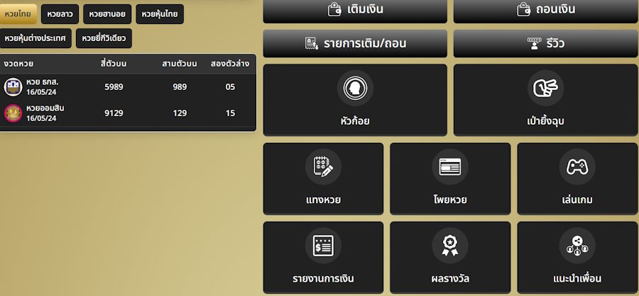 ในหน้าแรกปุ่มแทงหวยจะไม่ค่อยเด่นชัดซักเท่าไหร่เพราะปนอยู่กับปุ่มอื่นเยอะแยะ แต่ถ้ากวาดสายตาให้ดีจะพบว่าอยู่ตรงกลาง เมื่อกดแล้วก็จะเปิดแผงให้แทงหวยแต่ประเภทออกมา มีให้เลือกแทงหวยได้ 4 ประเภท คือ หวยไทย หวยลาว หวยเวียดนาม และหวยหุ้นต่างประเทศ