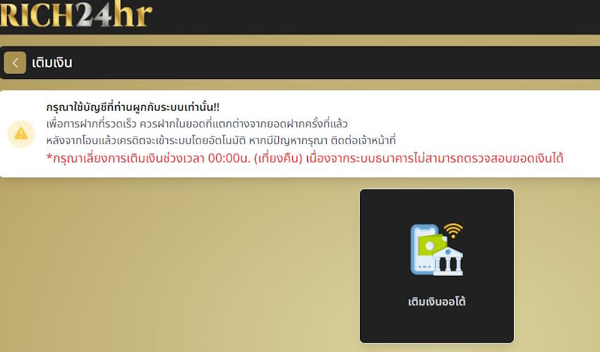 บอกได้เลยว่าจุดเด่นของเว็บ rich24hr.com อยู่ที่การเติมเงินและถอนเงิน การเติมเงินนั้นง่ายมาก และใช้เวลาไม่นาน ไม่เหมือนในหลายๆเว็บคือ ไม่ต้องรอระบบ 2-3 นาทีเพื่อให้ระบบทำการอับเดท ไม่ต้องอับโหลดสลิป