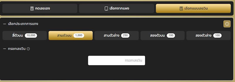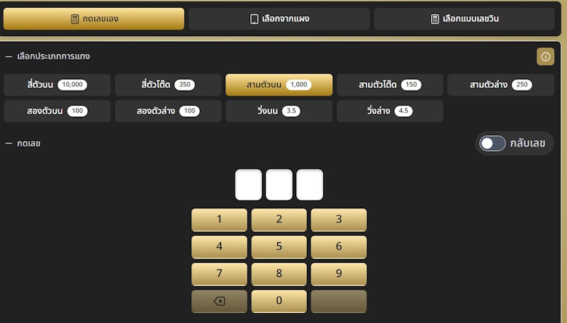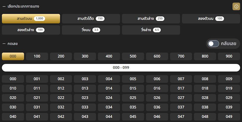 ในส่วนของการแทงนั้นก็ถือว่าง่าย ฟังก์ชั่นหลักก็จะเหมือนกับเว็บทั่วๆไปคือ เลือกแบบกรอกตัวเลขเอง และเลือกจากแผง แต่ที่เพิ่มใหม่ในเว็บนี้คือการแทงแบบเลขวินสำหรับการแทง 3 ตัว ซึ่งหลายๆเว็บไม่มี