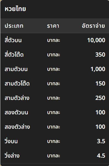 ในส่วนของหวยไทยเว็บนี้ค่อนข้างล้ำกว่าหลายๆเว็บตรงที่สามารถแทงหวยไทยได้ทันทีหลังจากที่หวยออกไปแล้ว 1 วัน ไม่เหมือนหลายๆเว็บที่หวยไทยจะยังไม่เปิดให้แทงทันทีจนกว่าจะเหลือถึง 5 หรือ 6 วันก่อนหวยออก