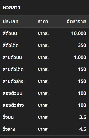 ในส่วนของหวยลาวและหวยเวียดนาม เว็บนี้ก็ล้ำไปอีกนิดกว่าเว็บเก่าๆคือเว็บทั่วไปหลายเว็บถ้าเป็นหวยลาวก็จะมีแค่ 2 แบบคือหวยลาวซุปเปอร์ และหวยลาวพัดทะนา แต่เว็บนี้มีหวยลาวประเภทอื่นรวมทั้งหมดเป็น 5 แบบ เรียกว่าได้แทงกันจุใจยืน 5 ทุ่มเลย